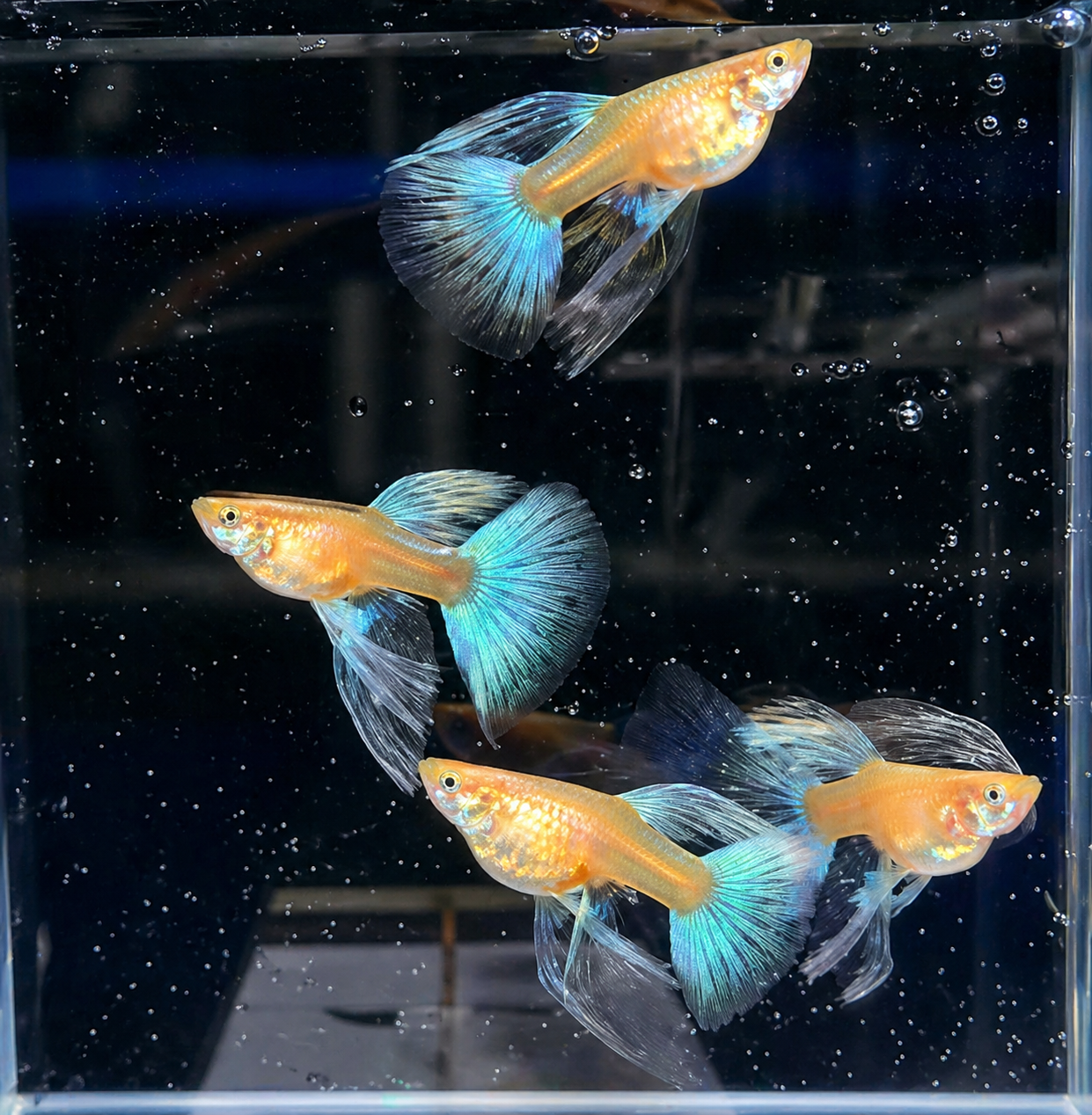 A premium guppy featuring bright blue topaz shine with refined Chinese genetics, known for its clean body, smooth fins, and elegant look.