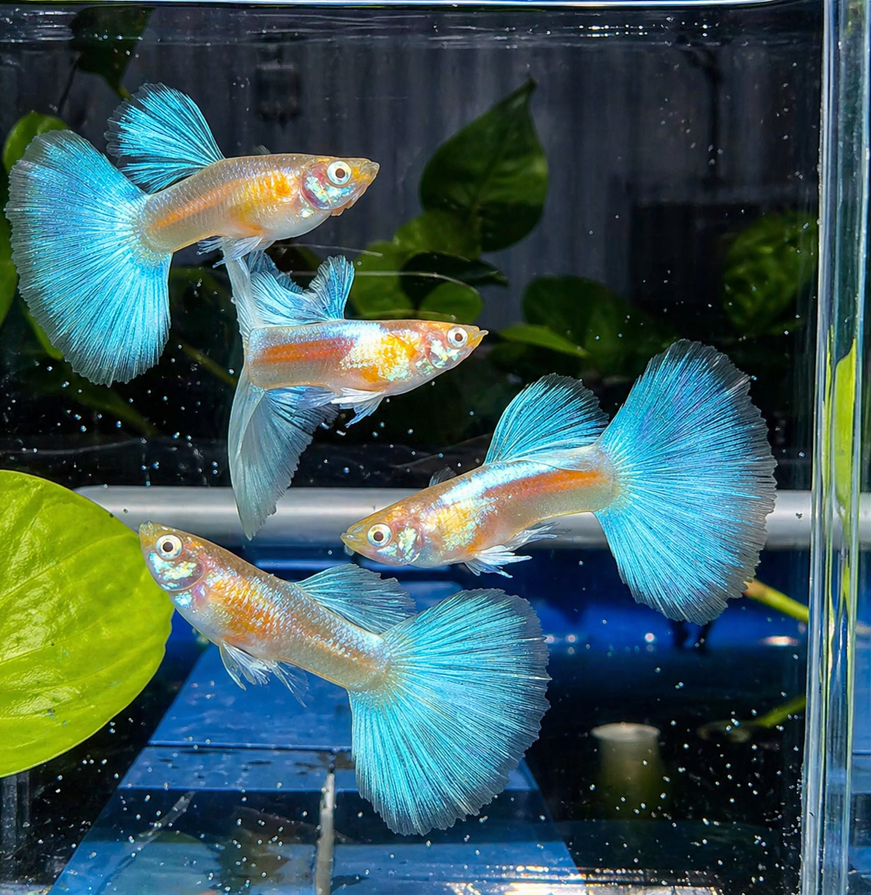 A stunning guppy with a shimmering blue topaz body and perfectly shaped round tail. Elegant, vibrant, and ideal for premium aquariums.