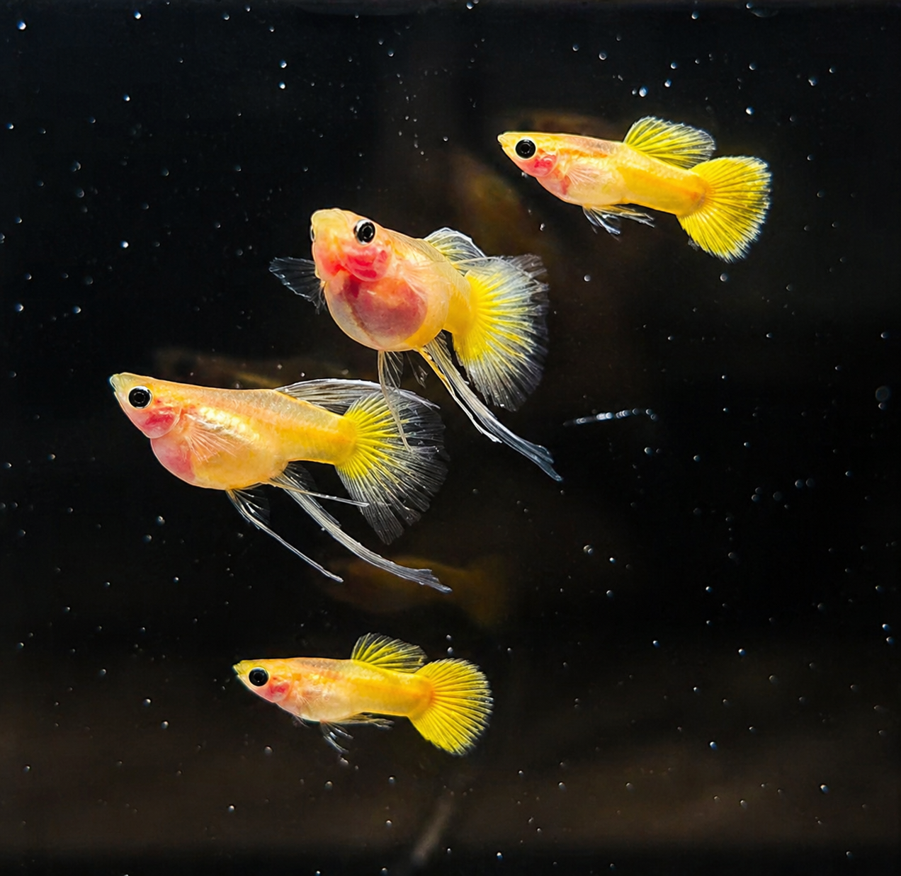 A perfect choice for hobbyists looking to add a bright and premium guppy variety to their collection. The combination of gold body and red fins creates a stunning visual effect, making this pair a standout in any aquarium setup.