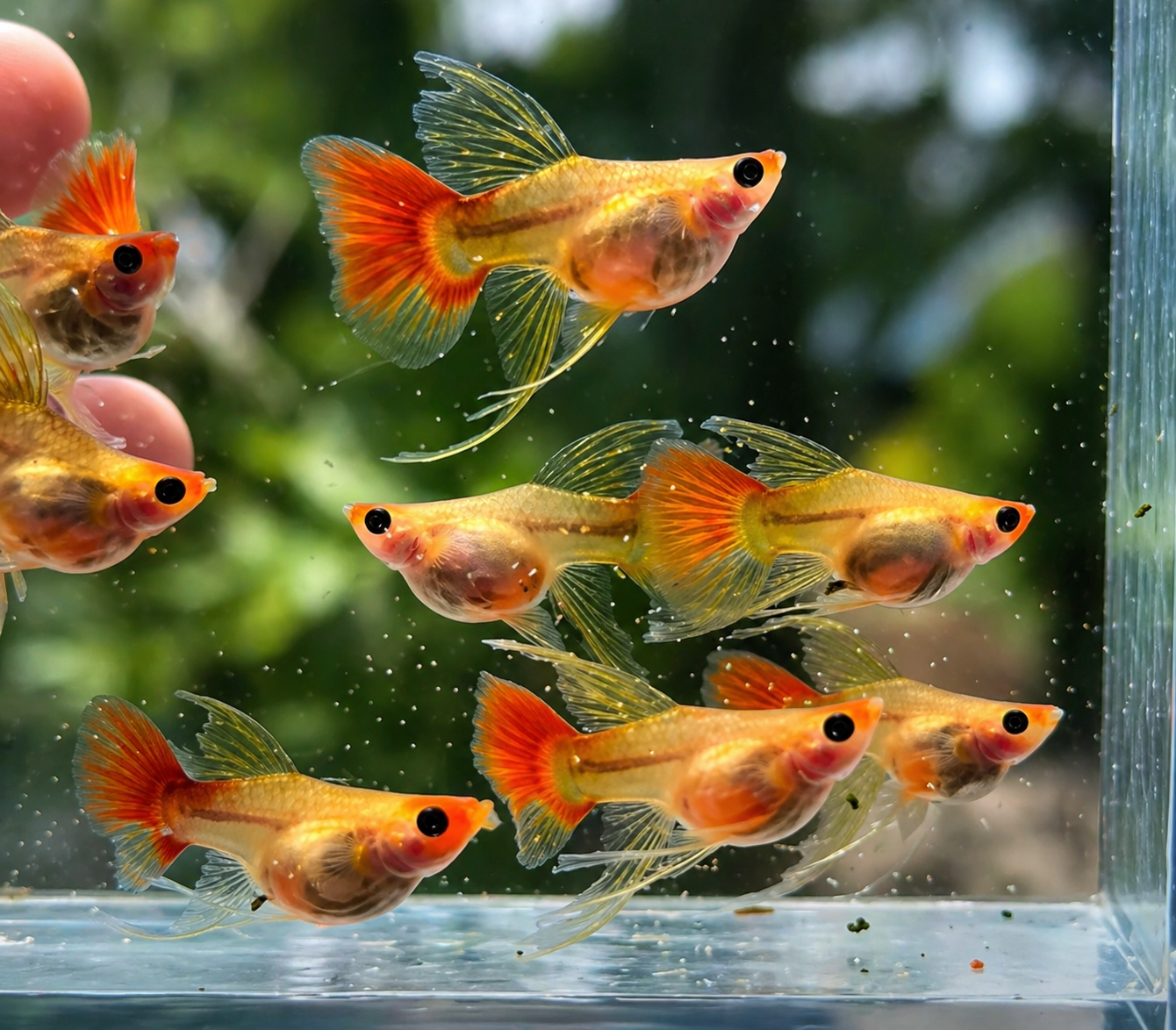 The Wild Koi Glassbelly Guppy Pair is a rare and captivating variety, admired for its semi-transparent glass-like body combined with vibrant koi-inspired patterns. The unique blend of orange, red, and subtle dark markings creates a natural yet striking appearance that truly stands out in any aquarium setup.